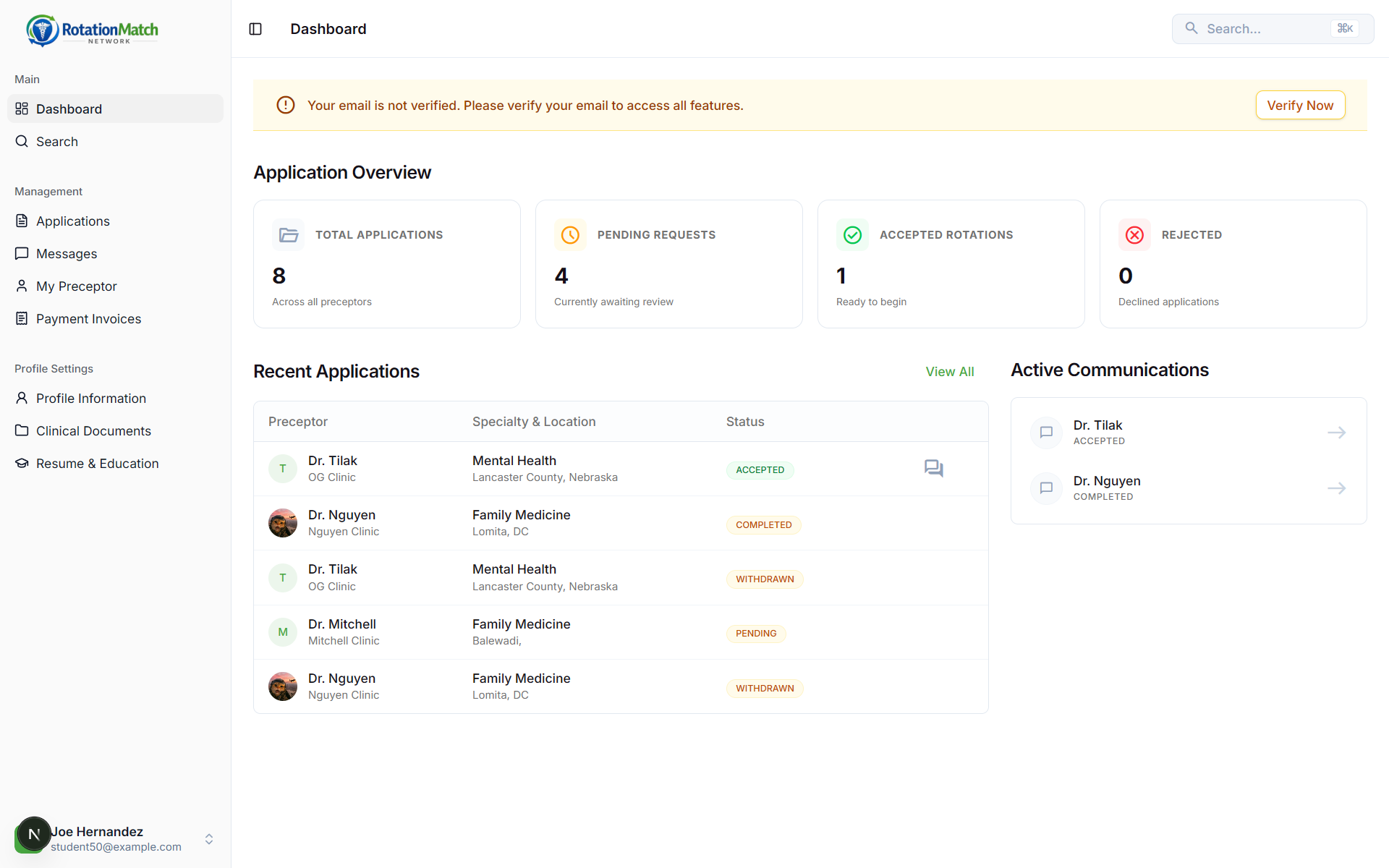 Students request placements, preceptors review, and admins verify documents in one secure workspace designed for healthcare education.